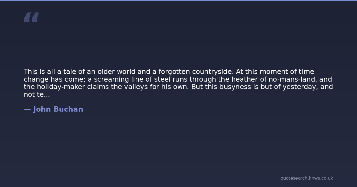 This is all a tale of an older world and a forgotten countryside. At this moment of time change has come; a screaming line of steel runs through the heather of no-mans-land, and the holiday-maker claims the valleys for his own. But this busyness is but of yesterday, and not ten years ago the fields lay quiet to the gaze of placid beasts and the wandering stars. This story I have culled from the grave of an old fashion, and set down for the love of a great soul and the poetry of life.