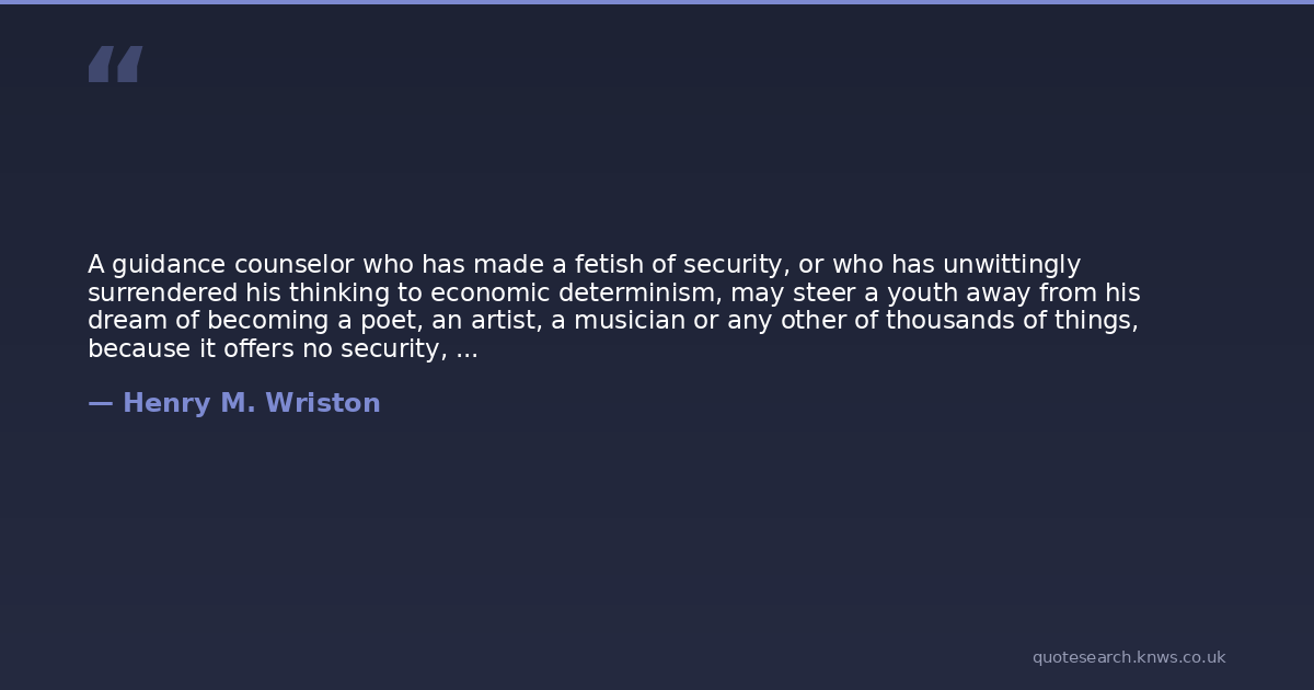 A guidance counselor who has made a fetish of security, or who has unwittingly surrendered his thinking to economic determinism, may steer a youth away from his dream of becoming a poet, an artist, a musician or any other of thousands of things, because it offers no security, it does not pay well, there are no vacancies, it has no "future".