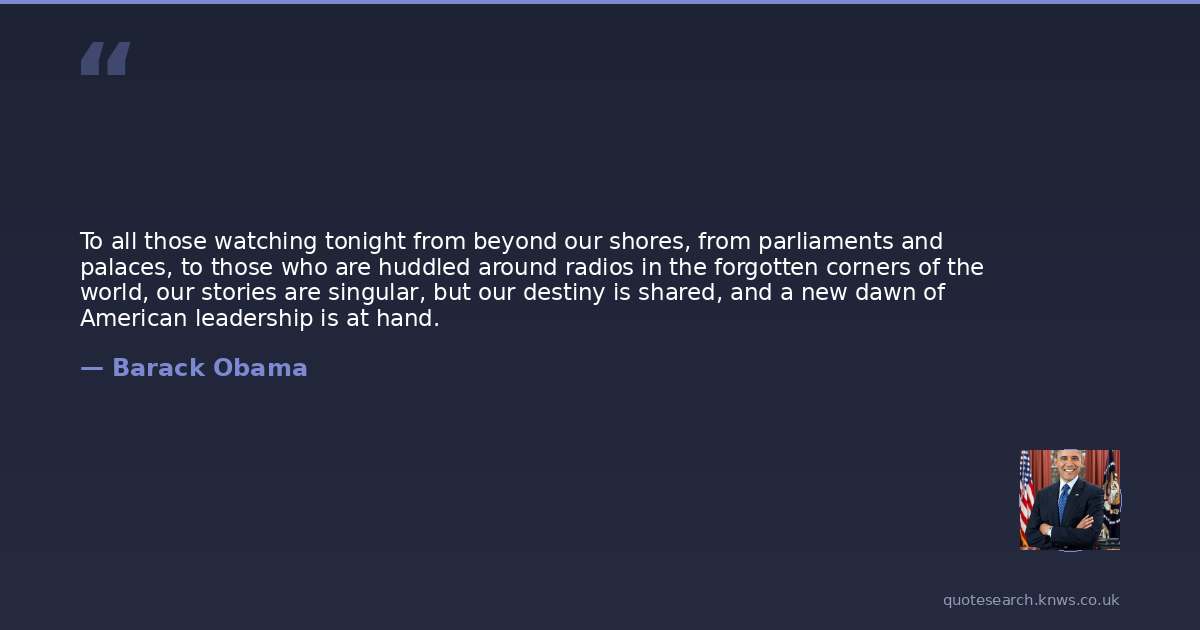 To all those watching tonight from beyond our shores, from parliaments and palaces, to those who are huddled around radios in the forgotten corners of the world, our stories are singular, but our destiny is shared, and a new dawn of American leadership is at hand.
