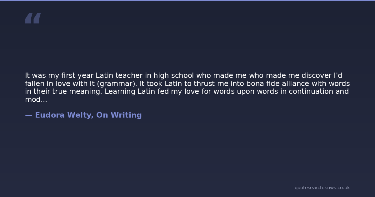 It was my first-year Latin teacher in high school who made me who made me discover I'd fallen in love with it (grammar). It took Latin to thrust me into bona fide alliance with words in their true meaning. Learning Latin fed my love for words upon words in continuation and modification, and the beautiful, sober, accretion of a sentence. I could see the achieved sentence finally standing there, as real, intact, and built to stay as the Mississippi State Capitol at the top of my street.