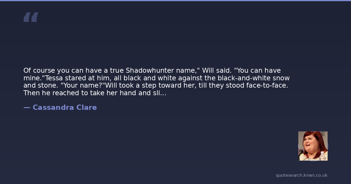 Of course you can have a true Shadowhunter name," Will said. "You can have mine."Tessa stared at him, all black and white against the black-and-white snow and stone. "Your name?"Will took a step toward her, till they stood face-to-face. Then he reached to take her hand and slid off her glove, which he put into his pocket. He held her bare hand in his, his fingers curved around hers. His hand was warm and callused, and his touch made her shiver. His eyes were steady and blue; they were everything that Will was: true and tender, sharp and witty, loving and kind. "Marry me," he said. "Marry me, Tess. Marry me and be called Tessa Herondale. Or be Tessa Gray, or be whatever you wish to call yourself, but marry me and stay with me and never leave me, for I cannot bear another day of my life to go by that does not have you in it.