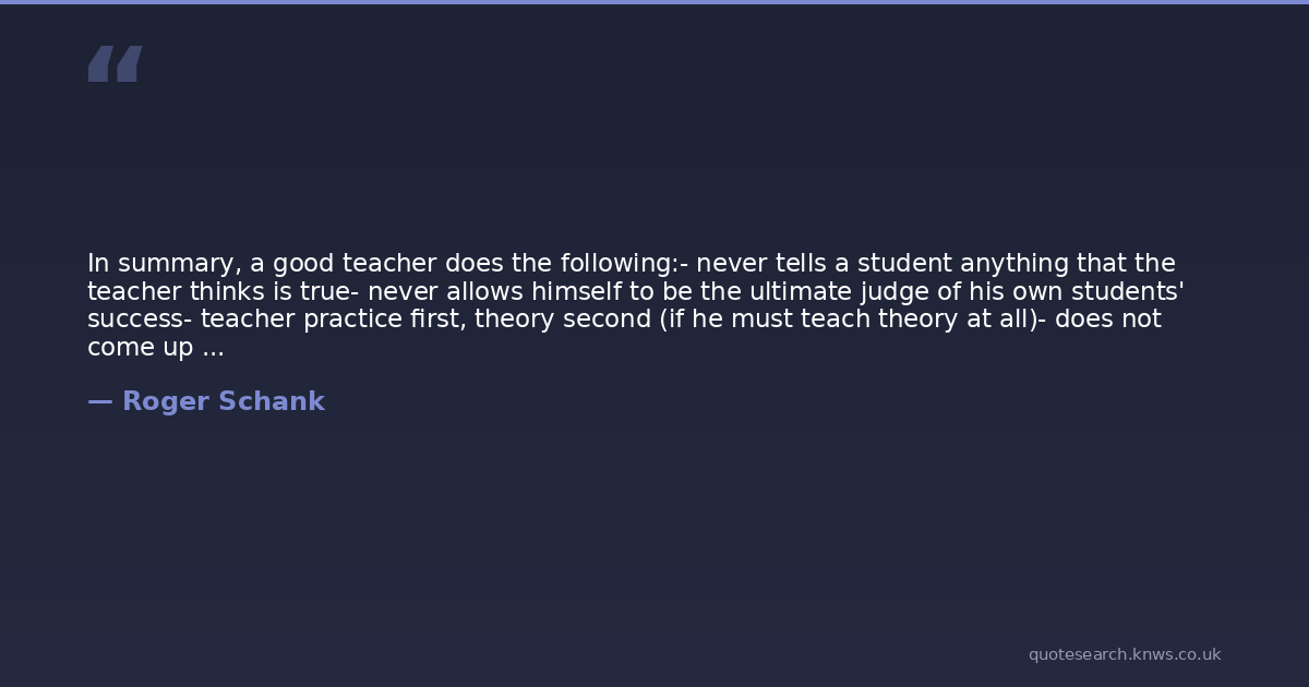 In summary, a good teacher does the following:- never tells a student anything that the teacher thinks is true- never allows himself to be the ultimate judge of his own students' success- teacher practice first, theory second (if he must teach theory at all)- does not come up with lists of knowledge that every student must know- doesn't teach anything unless he can easily explain the use of learning it- assigns no homework, unless that homework is to produce something- groups students according to their interests and abilities, not their ages- ensures that any reward to a student is intrinsic- teaches students things they may actually need to know after they leave school- helps students come up with their own explanations when they have made a mistake- never assumes that a student is listening to what he is saying- never assumes that students will do what he asks them to do if what he asked does not relate to a goal they truly hold- never allows pleasing the teacher to be the goal of the student- understands that students won't do what he tells them if they don't understand what is being asked of them- earns the respect of students by demonstrating abilities- motivate students to do better, and does not help them to do better- understands that his job is to get students to do something- understands that experience, not teachers, changes belief systems- confuses students- does not expect credit for good teaching