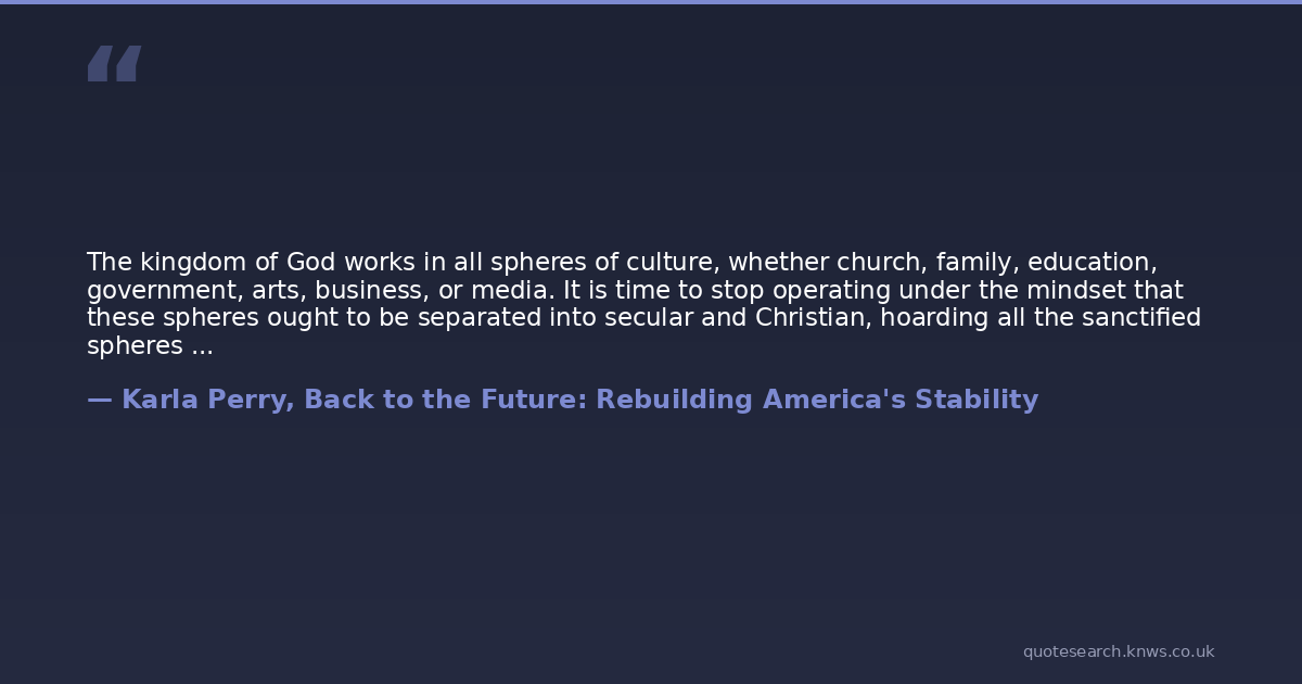The kingdom of God works in all spheres of culture, whether church, family, education, government, arts, business, or media. It is time to stop operating under the mindset that these spheres ought to be separated into secular and Christian, hoarding all the sanctified spheres into the church, thereby leaving the world struggling in a vacuum of death. When we suck all the living water into the church, the world is left to die of thirst.