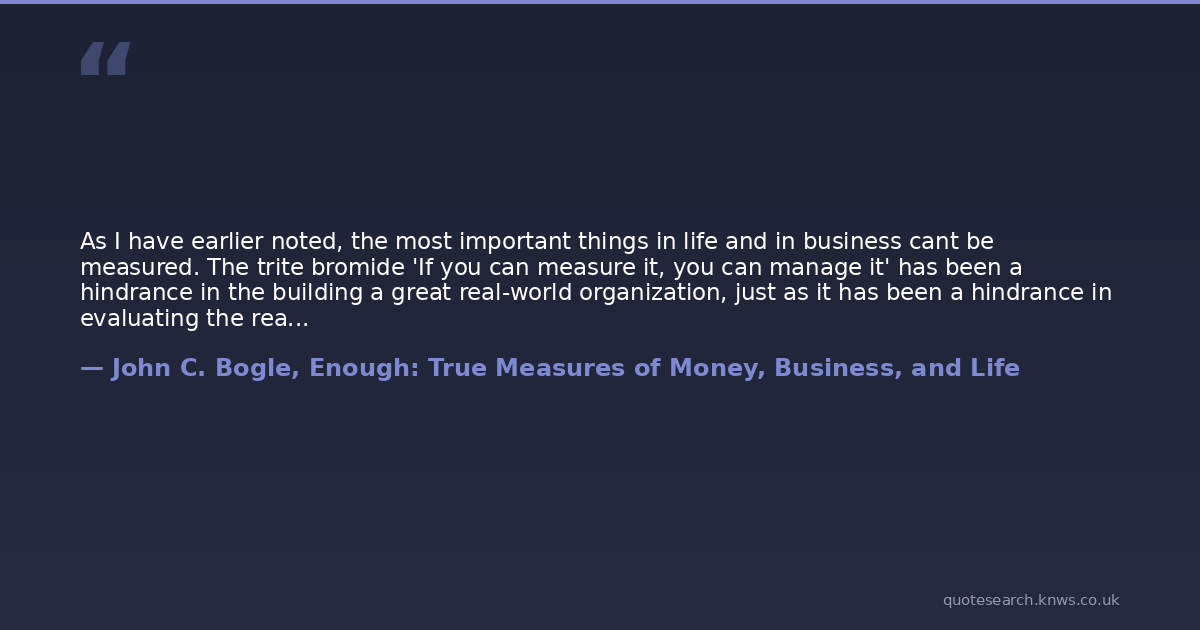 As I have earlier noted, the most important things in life and in business cant be measured. The trite bromide 'If you can measure it, you can manage it' has been a hindrance in the building a great real-world organization, just as it has been a hindrance in evaluating the real-world economy. It is character, not numbers, that make the world go round. How can we possibly measure the qualities of human existence that give our lives and careers meaning? How about grace, kindness, and integrity? What value do we put on passion, devotion, and trust? How much do cheerfulness, the lilt of a human voice, and a touch of pride add to our lives? Tell me, please, if you can, how to value friendship, cooperation, dedication, and spirit. Categorically, the firm that ignores the intangible qualities that the human beings who are our colleagues bring to their careers will never build a great workforce or a great organization.