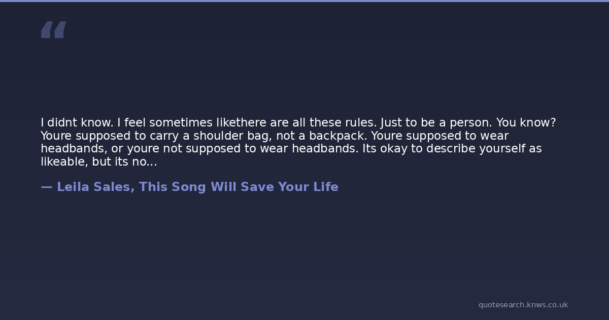 I didnt know. I feel sometimes likethere are all these rules. Just to be a person. You know? Youre supposed to carry a shoulder bag, not a backpack. Youre supposed to wear headbands, or youre not supposed to wear headbands. Its okay to describe yourself as likeable, but its not okay to describe yourself as eloquent. You can sit in the front of the school bus, but you cant sit in the middle. Youre not supposed to be with a boy, even when he wants you to. I didnt know that. There are so many rules, and they dont make any sense, and I just cant learn them all