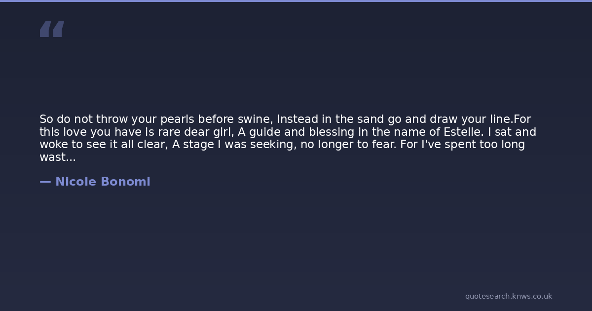 So do not throw your pearls before swine, Instead in the sand go and draw your line.For this love you have is rare dear girl, A guide and blessing in the name of Estelle. I sat and woke to see it all clear, A stage I was seeking, no longer to fear. For I've spent too long wasting precious time, Never again will I throw pearls before swine.