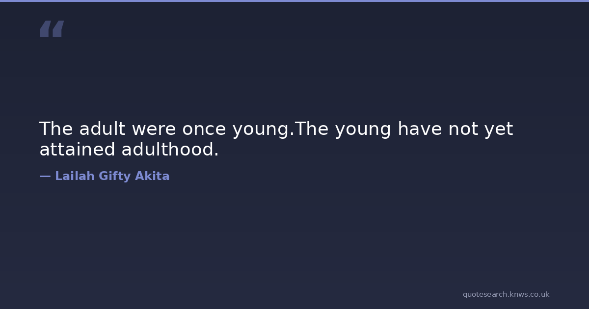 The adult were once young.The young have not yet attained adulthood. adulthood childhood growing-older growing-up wisdom-inspirational wisdom-quotes young-adult Download Image Share on X Share on Facebook Copy Link