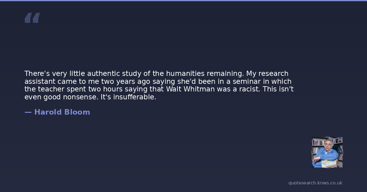 There's very little authentic study of the humanities remaining. My research assistant came to me two years ago saying she'd been in a seminar in which the teacher spent two hours saying that Walt Whitman was a racist. This isn't even good nonsense. It's insufferable.