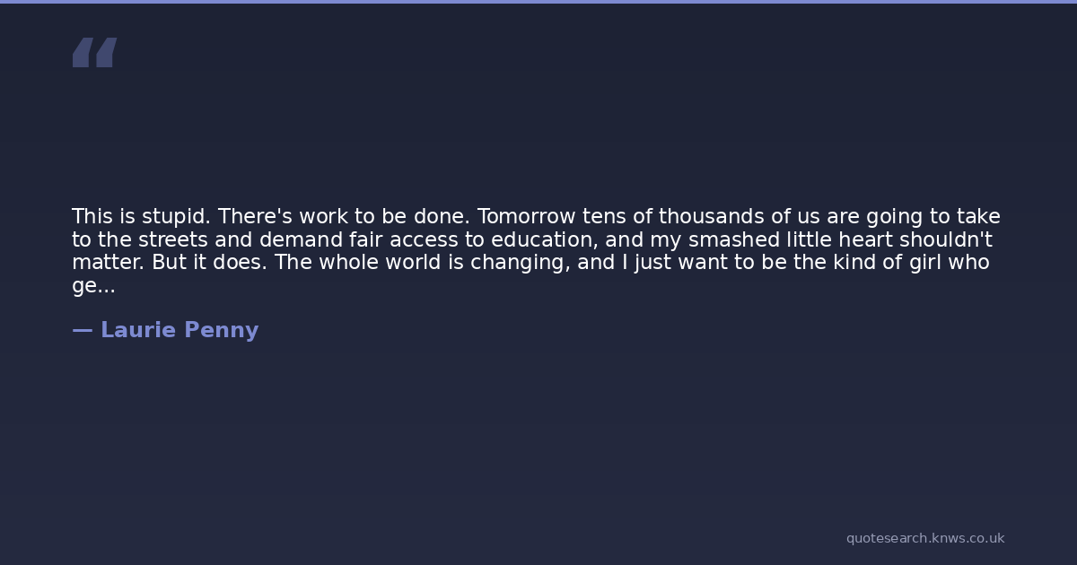 Laurie Penny was a contemporary English journalist, columnist and author. Laurie Penny is a British journalist and writer. Penny has written articles for publications including The Guardian, The Spectator, The New York Times, and Salon. Read more on Wikipedia →