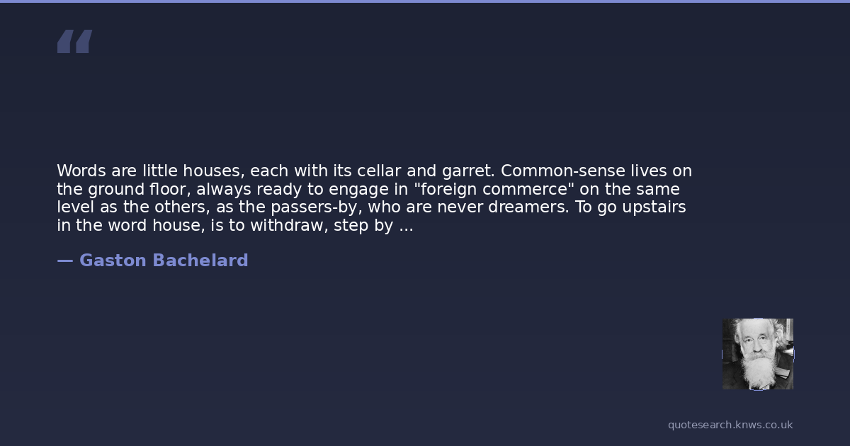 Words are little houses, each with its cellar and garret. Common-sense lives on the ground floor, always ready to engage in "foreign commerce" on the same level as the others, as the passers-by, who are never dreamers. To go upstairs in the word house, is to withdraw, step by step; while to go down to the cellar is to dream, it is losing oneself in the distant corridors of an obscure etymology, looking for treasures that cannot be found in words. To mount and descend in the words themselves - this is a poet's life. To mount too high or descend too low, is allowed in the case of poets, who bring earth and sky together.