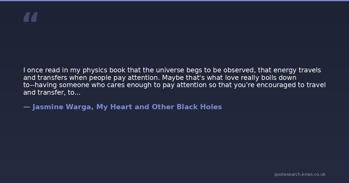 I once read in my physics book that the universe begs to be observed, that energy travels and transfers when people pay attention. Maybe that's what love really boils down to--having someone who cares enough to pay attention so that you're encouraged to travel and transfer, to make your potential energy spark into kinetic energy.