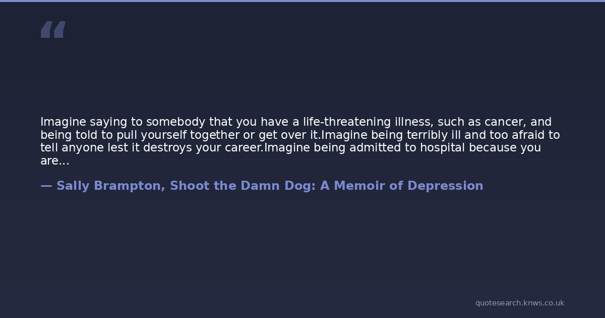 Imagine saying to somebody that you have a life-threatening illness, such as cancer, and being told to pull yourself together or get over it.Imagine being terribly ill and too afraid to tell anyone lest it destroys your career.Imagine being admitted to hospital because you are too ill to function and being too ashamed to tell anyone, because it is a psychiatric hospital.Imagine telling someone that you have recently been discharged and watching them turn away, in embarrassment or disgust or fear.Comparisons are odious. Stigmatising an illness is more odious still.