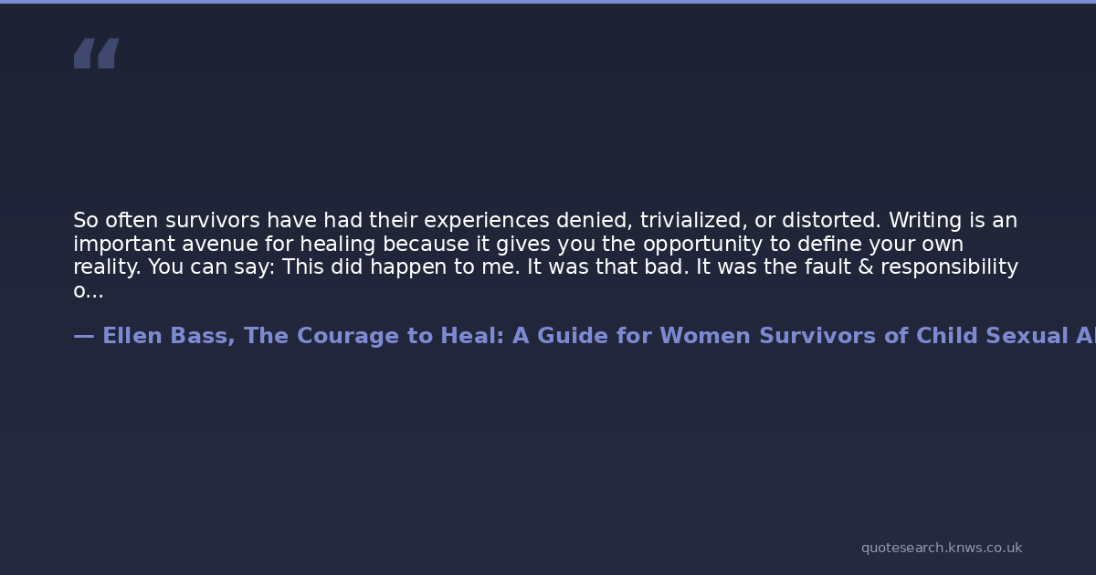 So often survivors have had their experiences denied, trivialized, or distorted. Writing is an important avenue for healing because it gives you the opportunity to define your own reality. You can say: This did happen to me. It was that bad. It was the fault & responsibility of the adult. I wasand aminnocent. The Courage to Heal by Ellen Bass & Laura Davis