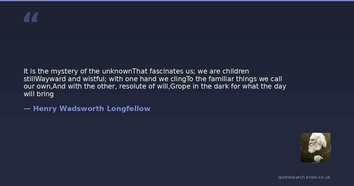 It is the mystery of the unknownThat fascinates us; we are children stillWayward and wistful; with one hand we clingTo the familiar things we call our own,And with the other, resolute of will,Grope in the dark for what the day will bring