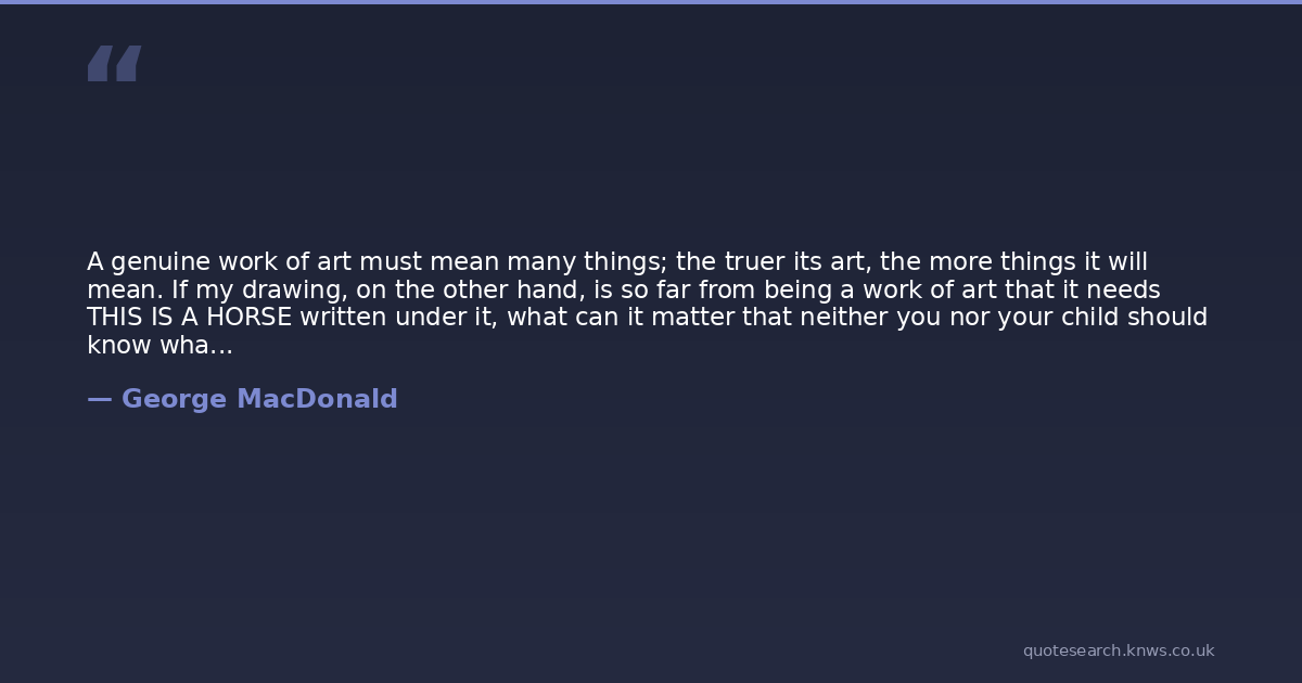 A genuine work of art must mean many things; the truer its art, the more things it will mean. If my drawing, on the other hand, is so far from being a work of art that it needs THIS IS A HORSE written under it, what can it matter that neither you nor your child should know what it means? It is there not so much to convey a meaning as to wake a meaning. If it do not even wake an interest, throw it aside. A meaning may be there, but it is not for you. If, again, you do not know a horse when you see it, the name written under it will not serve you much. At all events, the business of the painter is not to teach zoology.