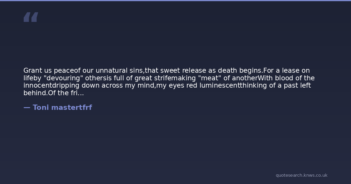 Grant us peaceof our unnatural sins,that sweet release as death begins.For a lease on lifeby "devouring" othersis full of great strifemaking "meat" of anotherWith blood of the innocentdripping down across my mind,my eyes red luminescentthinking of a past left behind.Of the friends I had madeand those I let downyet now I am afraidof finally shutting down.Yet I know deep insidethis is how it has to be, for humans to make strideyou have to kill me...