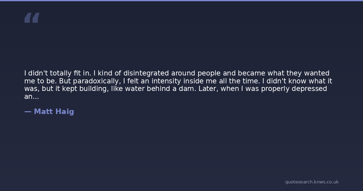 I didn't totally fit in. I kind of disintegrated around people and became what they wanted me to be. But paradoxically, I felt an intensity inside me all the time. I didn't know what it was, but it kept building, like water behind a dam. Later, when I was properly depressed and anxious, I saw the illness as an accumulation of all that thwarted intensity. A kind of breaking through. As though, if you find it hard enough to let your self be free, your self breaks in, flooding your mind in an attempt to drown all those failed half-versions of you.