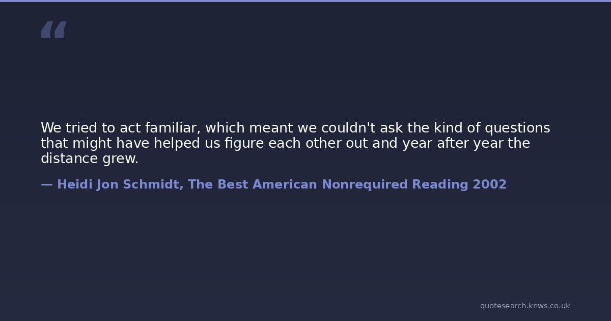 We tried to act familiar, which meant we couldn't ask the kind of questions that might have helped us figure each other out and year after year the distance grew.