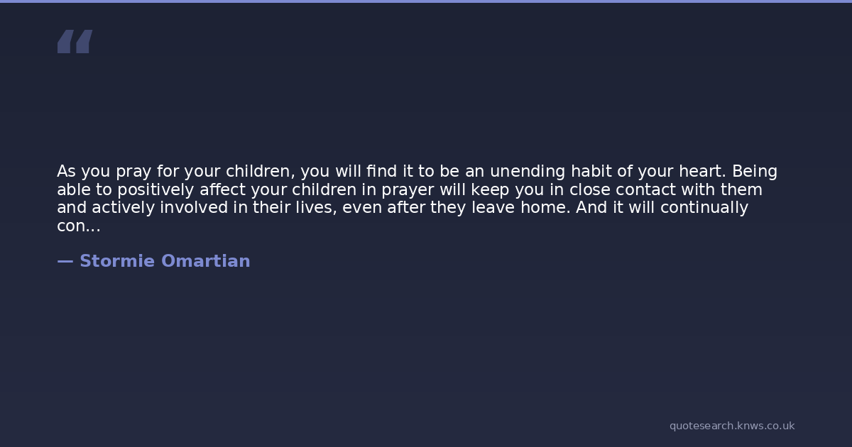 As you pray for your children, you will find it to be an unending habit of your heart. Being able to positively affect your children in prayer will keep you in close contact with them and actively involved in their lives, even after they leave home. And it will continually contribute to your joy as a parent!