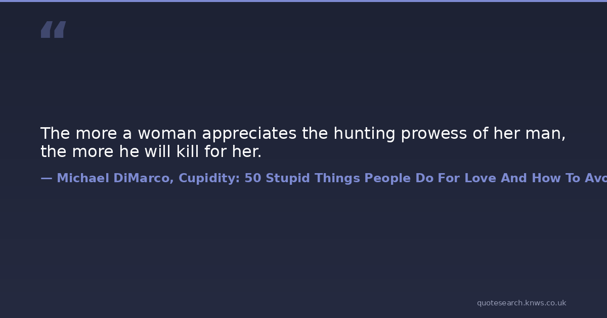 The more a woman appreciates the hunting prowess of her man, the more he will kill for her. appreciate guy hunting man relationships woman Download Image Share on X Share on Facebook Copy Link