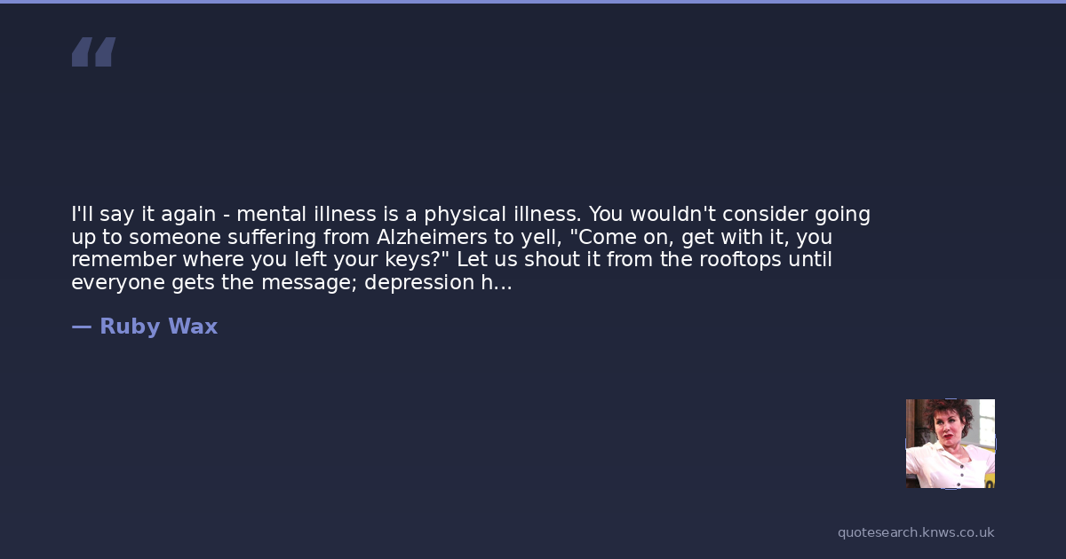 I'll say it again - mental illness is a physical illness. You wouldn't consider going up to someone suffering from Alzheimers to yell, "Come on, get with it, you remember where you left your keys?" Let us shout it from the rooftops until everyone gets the message; depression has and nothing to do with having a bad day or being sad, it's a killer if not taken seriously.