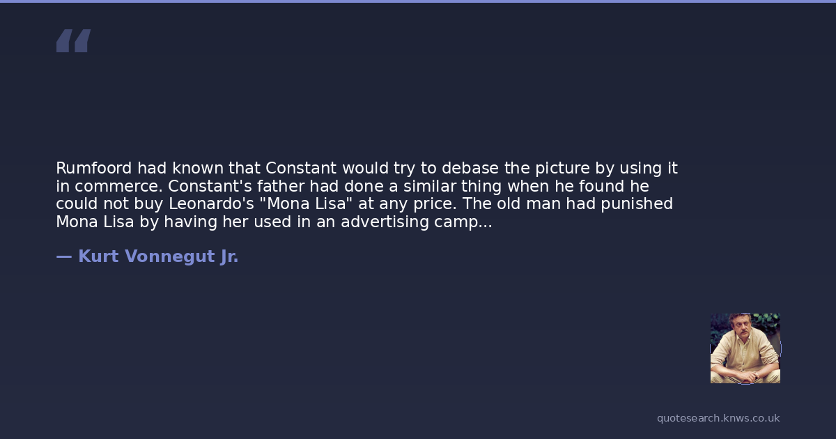 Rumfoord had known that Constant would try to debase the picture by using it in commerce. Constant's father had done a similar thing when he found he could not buy Leonardo's "Mona Lisa" at any price. The old man had punished Mona Lisa by having her used in an advertising campaign for suppositories. It was the free-enterprise way of handling beauty that threatened to get the upper hand.