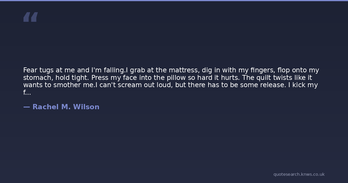 Fear tugs at me and I'm falling.I grab at the mattress, dig in with my fingers, flop onto my stomach, hold tight. Press my face into the pillow so hard it hurts. The quilt twists like it wants to smother me.I can't scream out loud, but there has to be some release. I kick my feet against the mattress in a muffled frenzy, legs flying fast and hard enough to carry me miles away. And when it's done, nothing's changed. I'm still stuck right here.