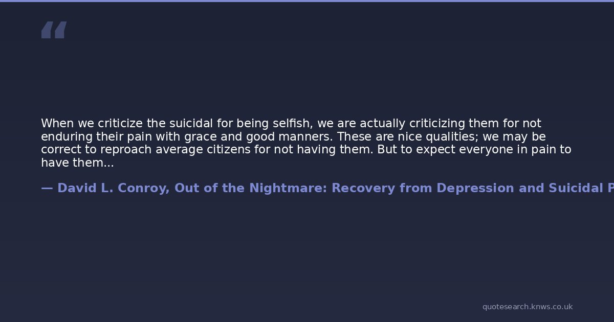 When we criticize the suicidal for being selfish, we are actually criticizing them for not enduring their pain with grace and good manners. These are nice qualities; we may be correct to reproach average citizens for not having them. But to expect everyone in pain to have them is unrealistic. Bearing pain quietly is what moralists call a supererogatory act--an act that is above the call of duty. Expecting everyone to who is suicidal to behave in a way that is morally above average is simply abusive.