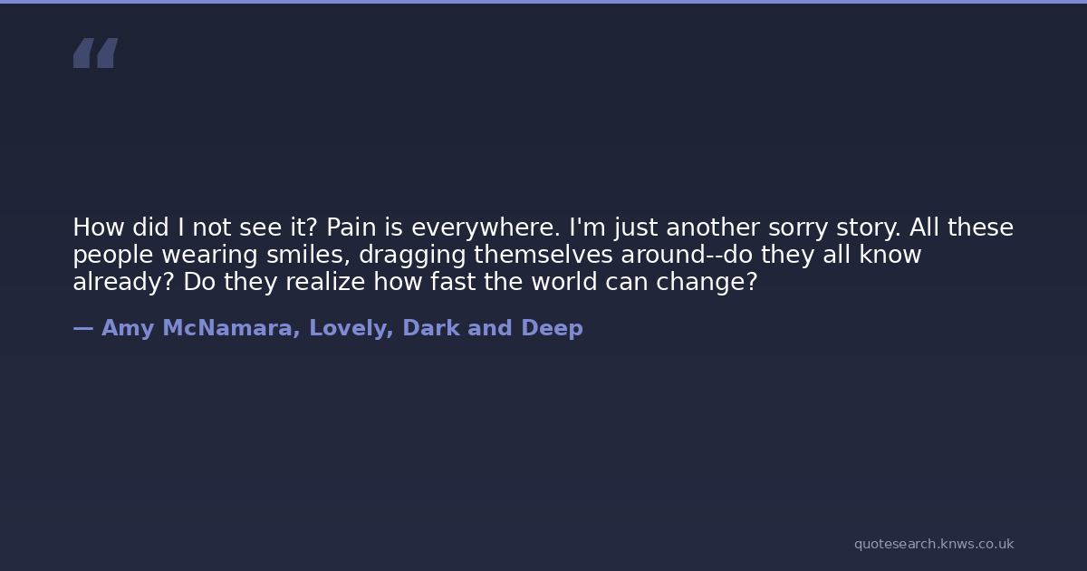 How did I not see it? Pain is everywhere. I'm just another sorry story. All these people wearing smiles, dragging themselves around--do they all know already? Do they realize how fast the world can change?