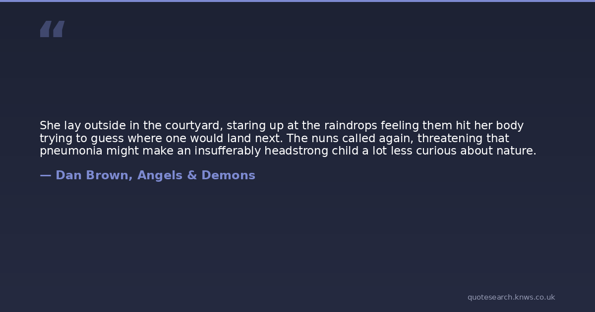 She lay outside in the courtyard, staring up at the raindrops feeling them hit her body trying to guess where one would land next. The nuns called again, threatening that pneumonia might make an insufferably headstrong child a lot less curious about nature.