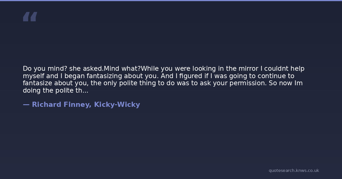 Do you mind? she asked.Mind what?While you were looking in the mirror I couldnt help myself and I began fantasizing about you. And I figured if I was going to continue to fantasize about you, the only polite thing to do was to ask your permission. So now Im doing the polite thing again and asking, do you mind?No, Nina. I dont mind at all.Then she leaned down and kissed him.