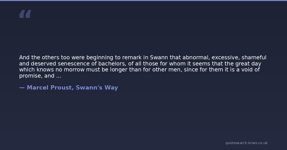 And the others too were beginning to remark in Swann that abnormal, excessive, shameful and deserved senescence of bachelors, of all those for whom it seems that the great day which knows no morrow must be longer than for other men, since for them it is a void of promise, and from its dawn the moments steadily accumulate without any subsequent partition among offspring.
