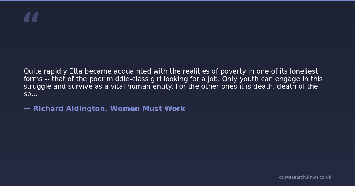 Quite rapidly Etta became acquainted with the realities of poverty in one of its loneliest forms -- that of the poor middle-class girl looking for a job. Only youth can engage in this struggle and survive as a vital human entity. For the other ones it is death, death of the spirit, because the pittance, the bit of bread and drink, the wisp of clothing, the flicker of fire must be begged of Business, not even as charity, but as a gracious boon in exchange for the best waking hours. It is always your money _and_ your life. Not that Business is intelligently ruthless, don't think it. Business is like a huge cretin, scuffing its great feet over the flower-beds of life while it thinks itself the most wonderful puffing billy, self-invented into the bargain.