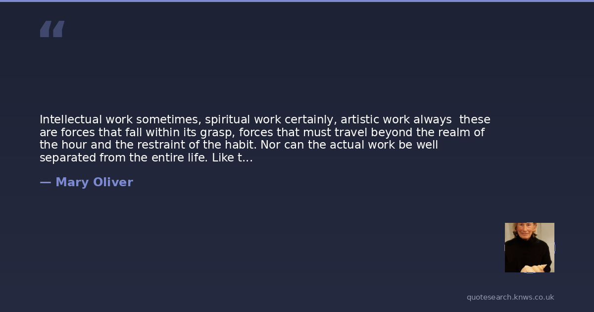 Intellectual work sometimes, spiritual work certainly, artistic work always these are forces that fall within its grasp, forces that must travel beyond the realm of the hour and the restraint of the habit. Nor can the actual work be well separated from the entire life. Like the knights of the Middle Ages, there is little the creatively inclined person can do but to prepare himself, body and spirit, for the labor to come for his adventures are all unknown. In truth, the work itself is the adventure. And no artist could go about this work, or would want to, with less than extraordinary energy and concentration. The extraordinary is what art is about.
