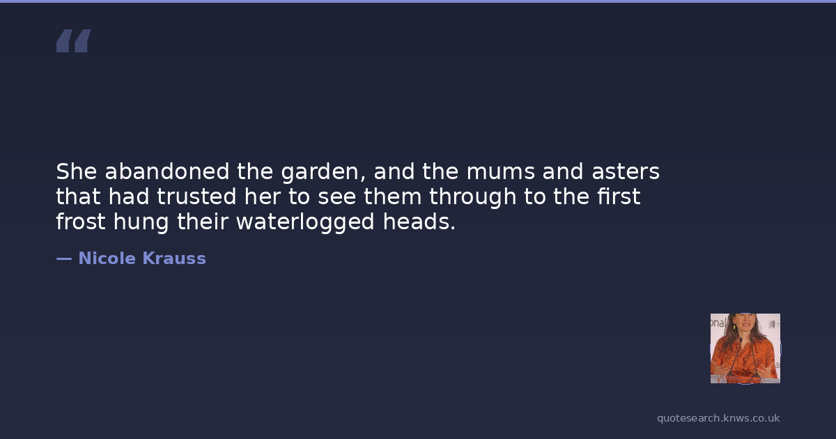 She abandoned the garden, and the mums and asters that had trusted her to see them through to the first frost hung their waterlogged heads.