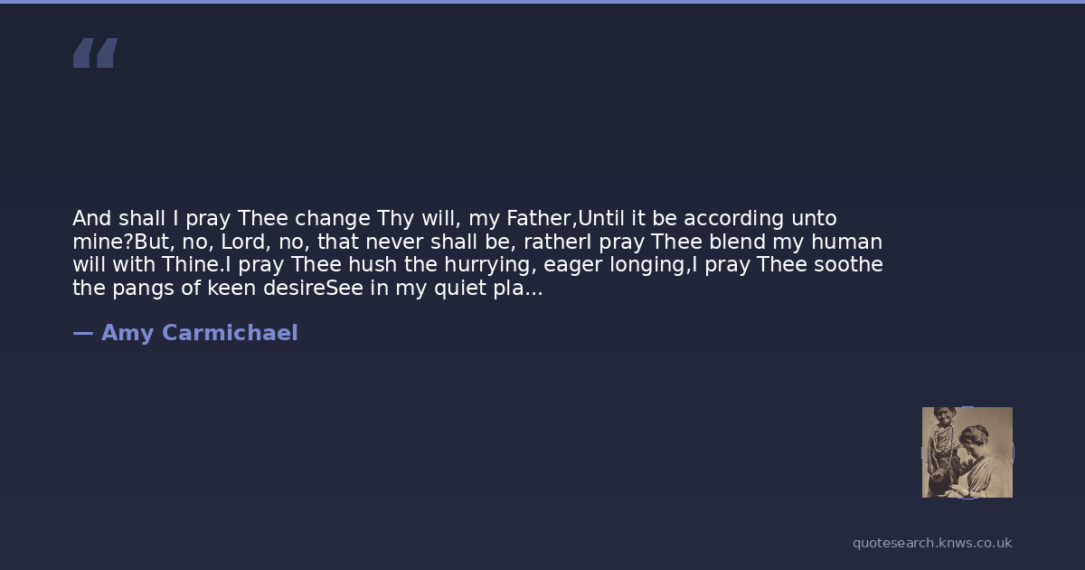 And shall I pray Thee change Thy will, my Father,Until it be according unto mine?But, no, Lord, no, that never shall be, ratherI pray Thee blend my human will with Thine.I pray Thee hush the hurrying, eager longing,I pray Thee soothe the pangs of keen desireSee in my quiet places, wishes throngingForbid them, Lord, purge, though it be with fire.