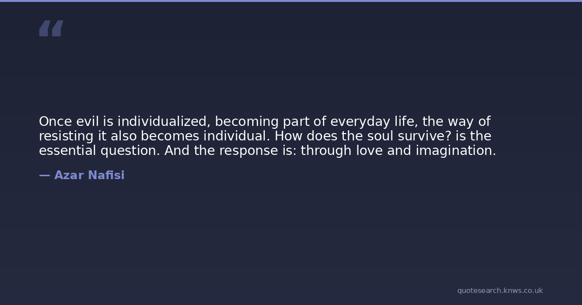 Once evil is individualized, becoming part of everyday life, the way of resisting it also becomes individual. How does the soul survive? is the essential question. And the response is: through love and imagination.