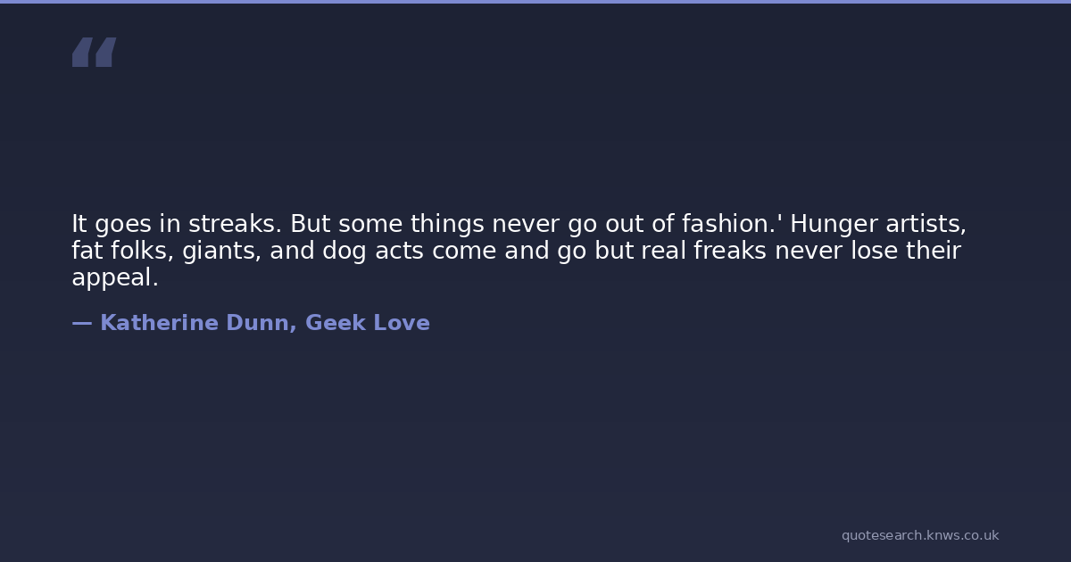 It goes in streaks. But some things never go out of fashion.' Hunger artists, fat folks, giants, and dog acts come and go but real freaks never lose their appeal.