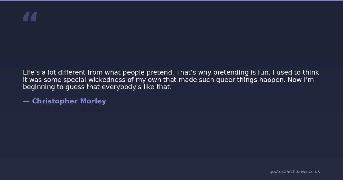 Life's a lot different from what people pretend. That's why pretending is fun. I used to think it was some special wickedness of my own that made such queer things happen. Now I'm beginning to guess that everybody's like that.