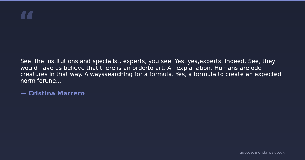See, the institutions and specialist, experts, you see. Yes, yes,experts, indeed. See, they would have us believe that there is an orderto art. An explanation. Humans are odd creatures in that way. Alwayssearching for a formula. Yes, a formula to create an expected norm forunexplainable greatness. A cook book you might say. Yes, a recipebook for life, love, and art. However, my dear, let me tell you. Yes,there is no such thing. Every individual is unique in their own design,as intended by God himself. We classify, yes, always must we classify,for if not, then we would be lost, yes lost now wouldn't we?Classification, order, expectations, but alas, we forget. For what is art,if not the out word expression of an artist. It is the soul of the artisanand if his expectations are met, than who are we to judge whether hiswork be art or not?