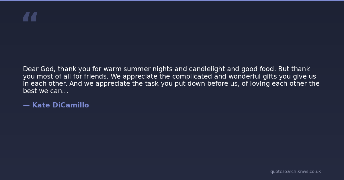 Dear God, thank you for warm summer nights and candlelight and good food. But thank you most of all for friends. We appreciate the complicated and wonderful gifts you give us in each other. And we appreciate the task you put down before us, of loving each other the best we can, even as you love us. We pray in Christ's name, Amen.