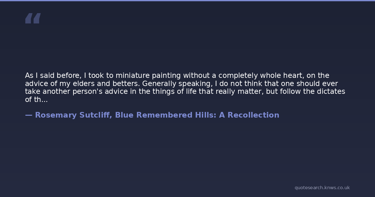 As I said before, I took to miniature painting without a completely whole heart, on the advice of my elders and betters. Generally speaking, I do not think that one should ever take another person's advice in the things of life that really matter, but follow the dictates of the still small something in one's innermost self. But 'they' advised, and I bowed to the advice; and in this particular instance it was a good thing I did, because the advice turned out to be so resoundingly wrong that it turned me into another direction altogether. If I had gone on working in oils I might very well have been a dedicated but unsuccessful painter to this day.