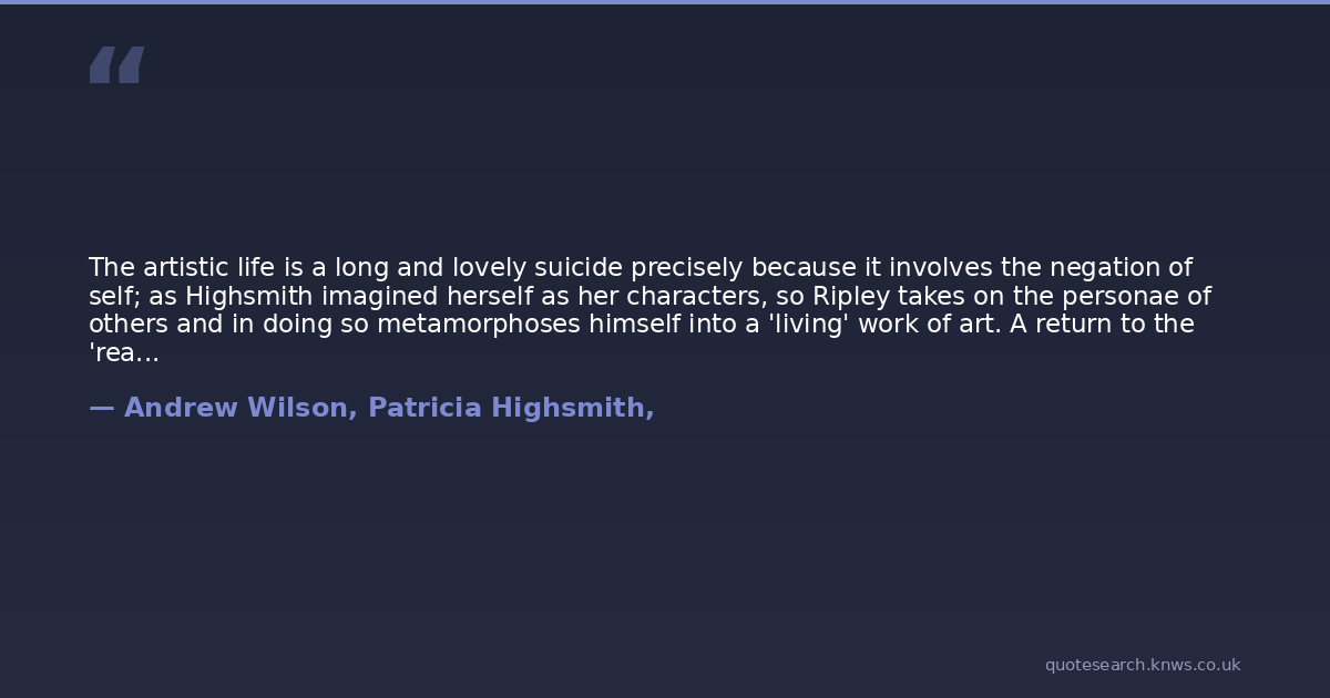 The artistic life is a long and lovely suicide precisely because it involves the negation of self; as Highsmith imagined herself as her characters, so Ripley takes on the personae of others and in doing so metamorphoses himself into a 'living' work of art. A return to the 'real life' after a period of creativity resulted in a fall in spirits, an agony Highsmith felt acutely. She voiced this pain in the novel via Bernard's quotation of an excerpt from Derwatt's notebook: 'There is no depression for the artist except that caused by a return to the self'.