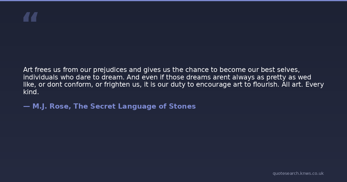 Art frees us from our prejudices and gives us the chance to become our best selves, individuals who dare to dream. And even if those dreams arent always as pretty as wed like, or dont conform, or frighten us, it is our duty to encourage art to flourish. All art. Every kind.