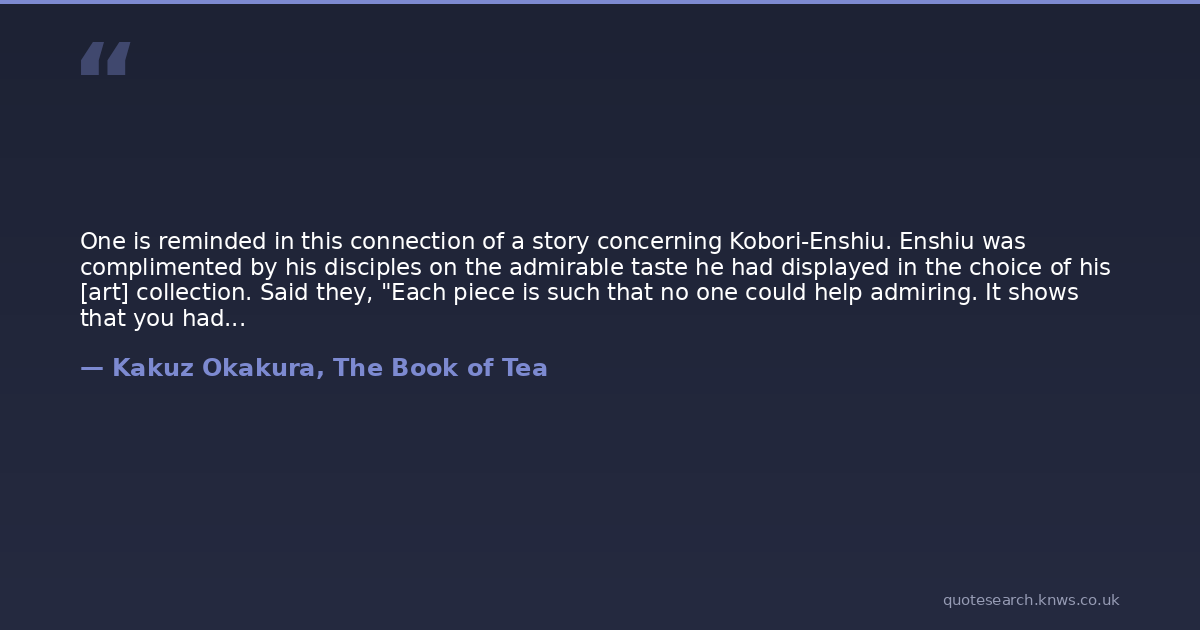 One is reminded in this connection of a story concerning Kobori-Enshiu. Enshiu was complimented by his disciples on the admirable taste he had displayed in the choice of his [art] collection. Said they, "Each piece is such that no one could help admiring. It shows that you had better taste than had Rikiu, for his collection could only be appreciated by one beholder in a thousand." Sorrowfully Enshiu replied: "This only proves how commonplace I am. The great Rikiu dared to love only those objects which personally appealed to him, whereas I unconsciously cater to the taste of the majority. Verily, Rikiu was one in a thousand among tea-masters.