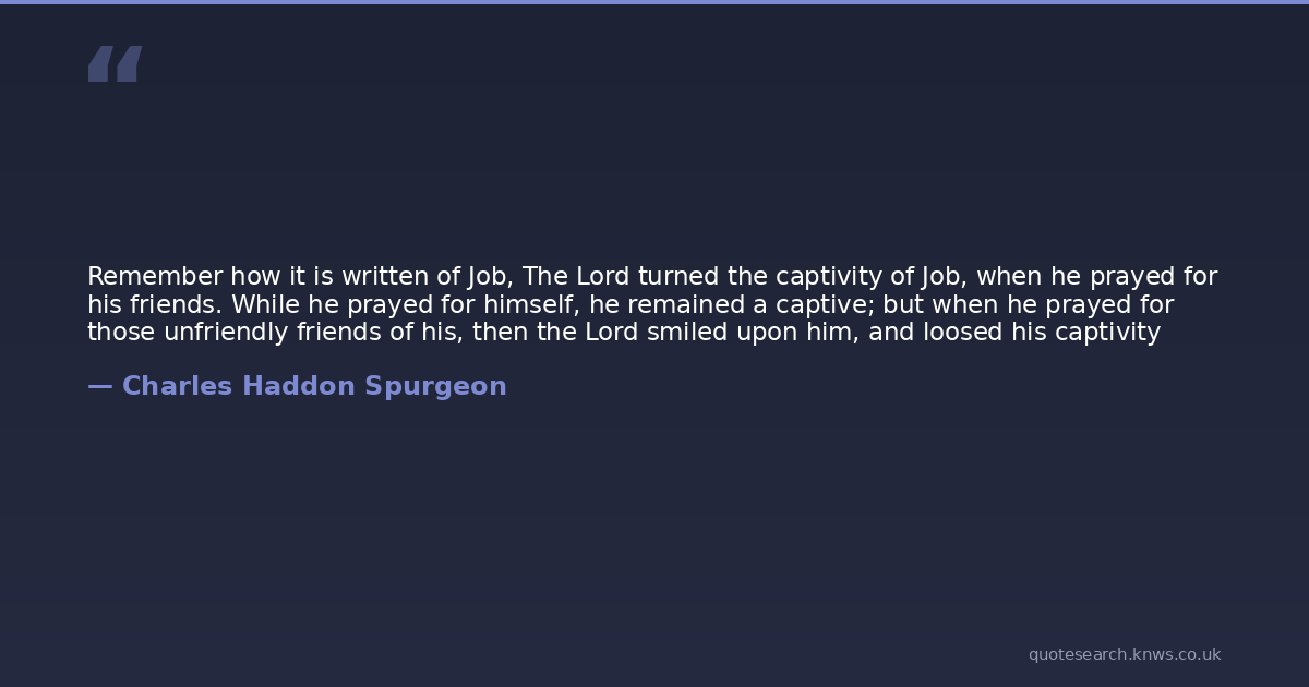 Remember how it is written of Job, The Lord turned the captivity of Job, when he prayed for his friends. While he prayed for himself, he remained a captive; but when he prayed for those unfriendly friends of his, then the Lord smiled upon him, and loosed his captivity