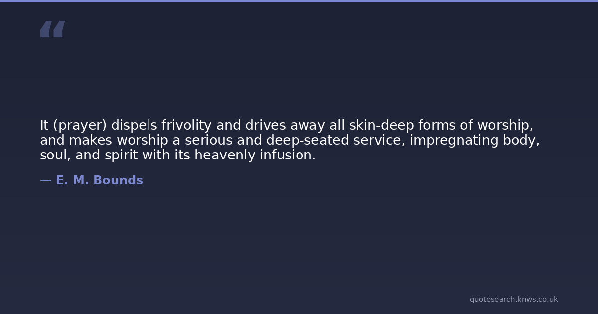 It (prayer) dispels frivolity and drives away all skin-deep forms of worship, and makes worship a serious and deep-seated service, impregnating body, soul, and spirit with its heavenly infusion.
