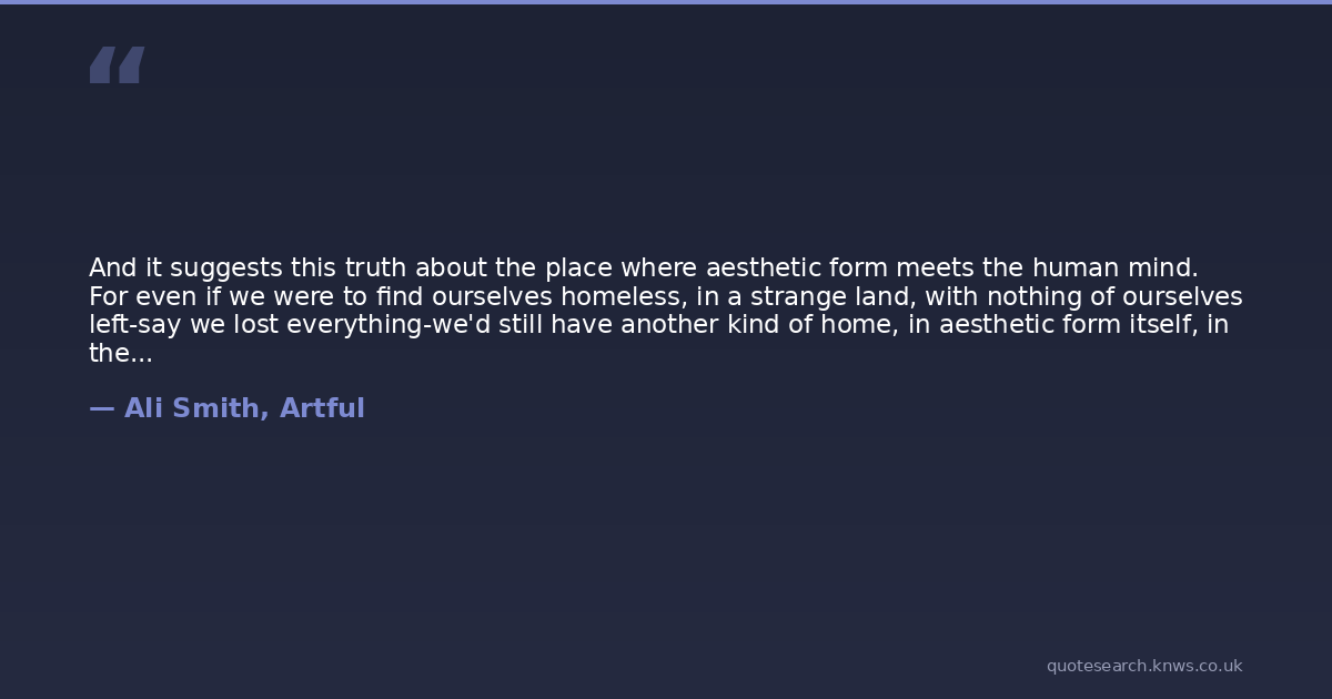 And it suggests this truth about the place where aesthetic form meets the human mind. For even if we were to find ourselves homeless, in a strange land, with nothing of ourselves left-say we lost everything-we'd still have another kind of home, in aesthetic form itself, in the familiarity, the unchanging assurance that a known rhythm, a recognised line, the familiar shape of a story, a tune, a line or phrase or sentence gives us every time, even long after we've forgotten we even know it.