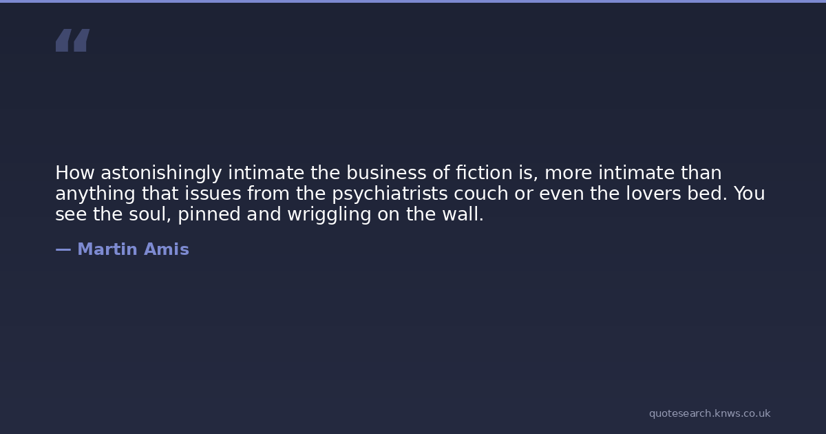 How astonishingly intimate the business of fiction is, more intimate than anything that issues from the psychiatrists couch or even the lovers bed. You see the soul, pinned and wriggling on the wall.