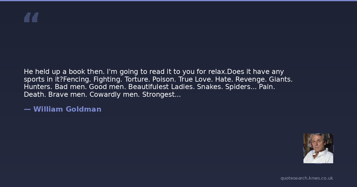 He held up a book then. I'm going to read it to you for relax.Does it have any sports in it?Fencing. Fighting. Torture. Poison. True Love. Hate. Revenge. Giants. Hunters. Bad men. Good men. Beautifulest Ladies. Snakes. Spiders... Pain. Death. Brave men. Cowardly men. Strongest men. Chases. Escapes. Lies. Truths. Passion. Miracles.Sounds okay, I said and I kind of closed my eyes.